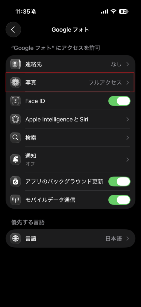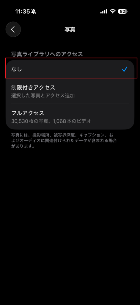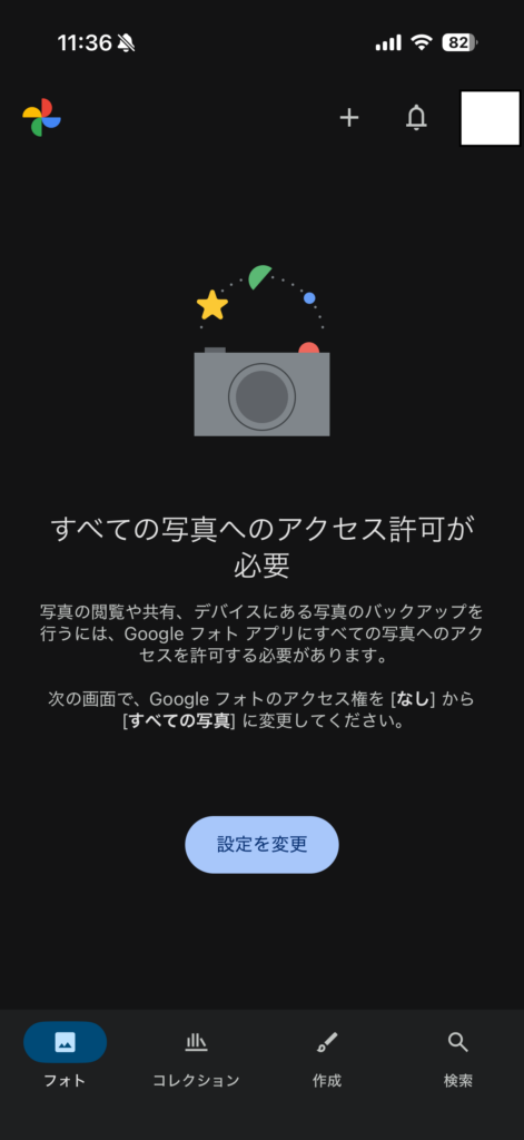 ステップ②:Googleフォトアプリの写真アクセスを「なし」に変更