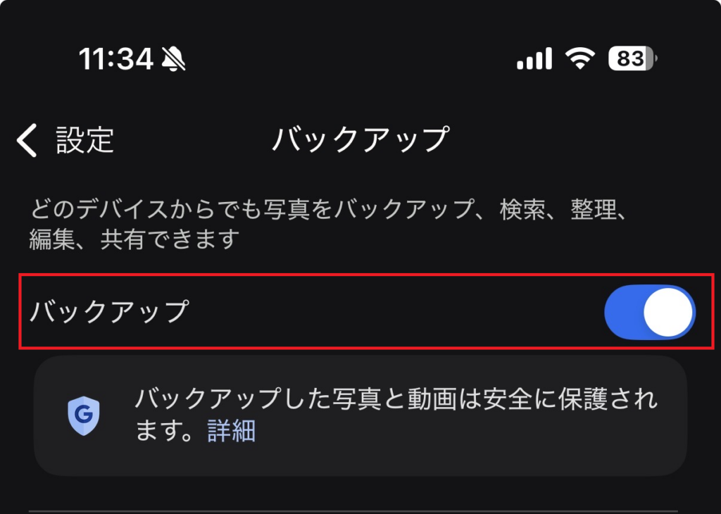 Googleフォトアプリをインストールして「バックアップと同期」をオンにすると、iPhone内の写真や動画が自動でGoogleアカウントにアップロードされます。